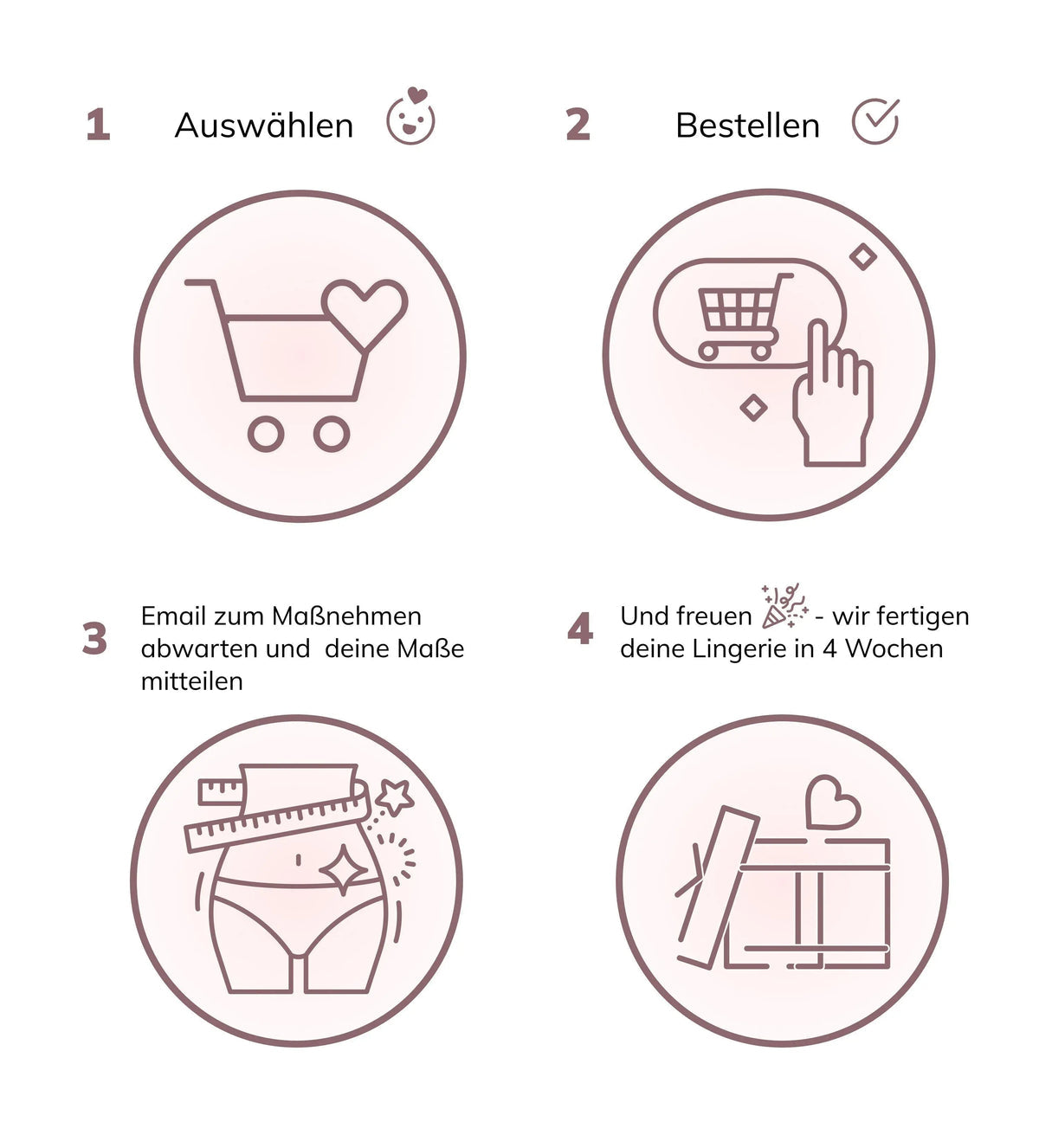 Unsere Lingerie wird in sorgsamer Handarbeit maßgeschneidert für dich hergestellt. Die Fertigung und Zustellung dauern ca 4 Wochen. Versicherter Versand mit DHL oder DPD.